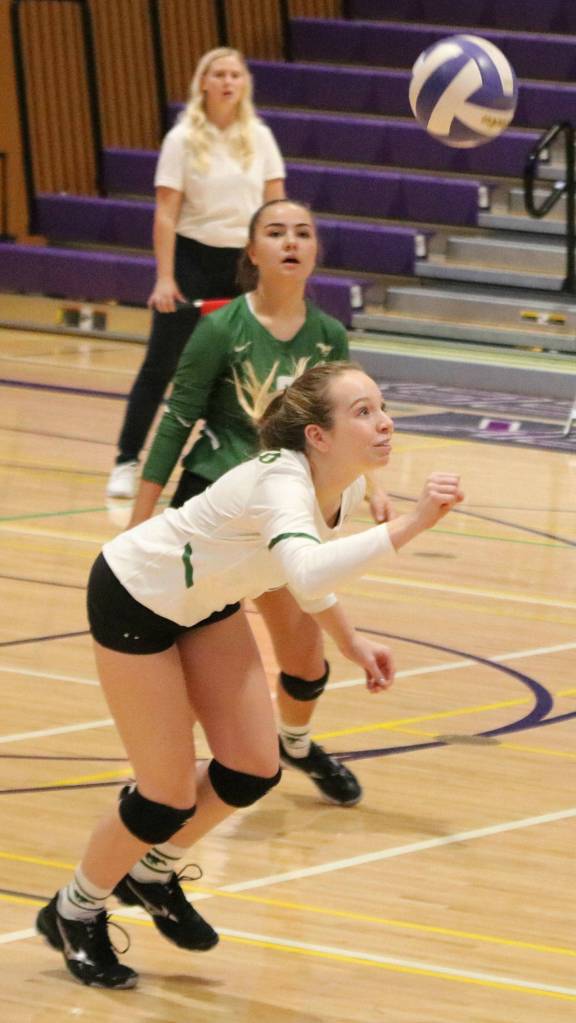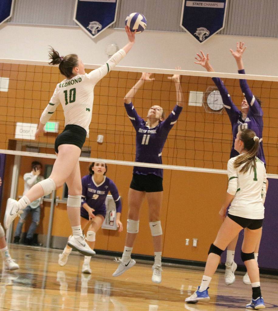 Top: Redmond High’s Maya Holmen (left) attacks the net against North Creek High players during the 4A KingCo tournament on Oct. 25 at North Creek. North Creek won, 3-0. The Mustangs played stellar ball in the thrilling matchup, losing 25-17, 25-23 and 28-26. Redmond lost to Mount Si on Saturday and to Woodinville on Tuesday to end its season. Mustangs Holmen and Piper Ferch are second-team all-leaguers and Caroline Talbot and Mari Torgersen are honorable mentions. Andy Nystrom / staff photo