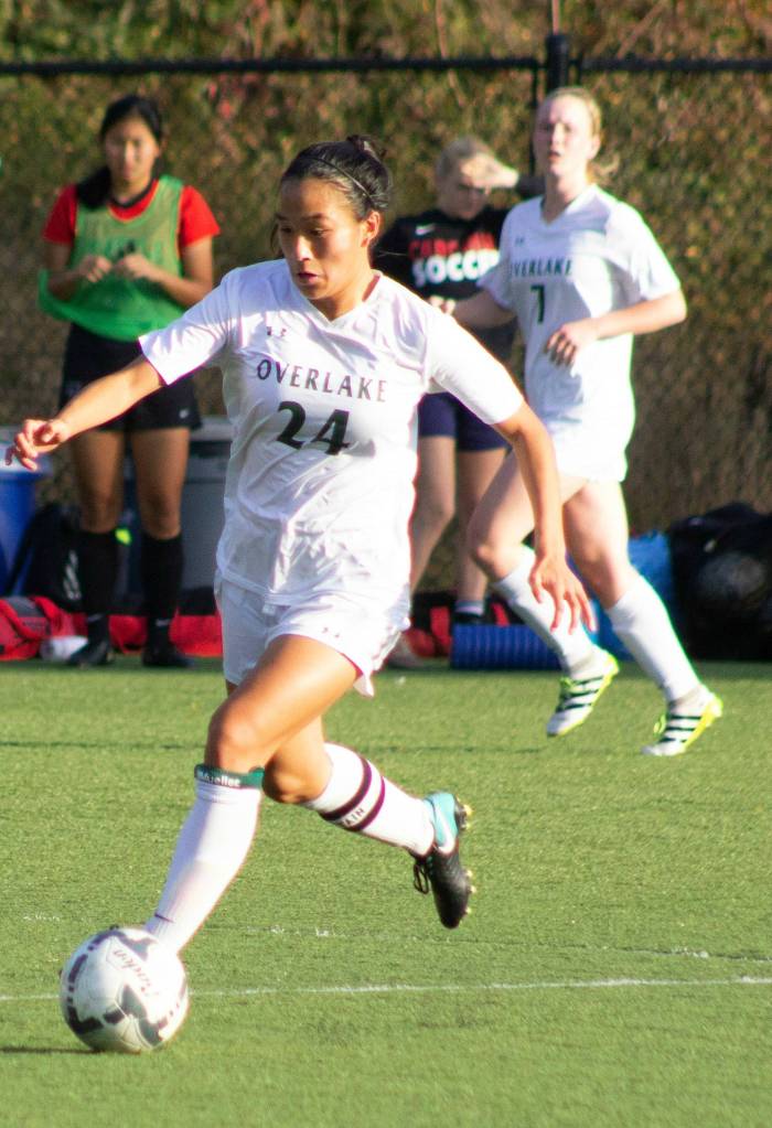 Overlake’s Kayla Ngai moves the ball up field while Serena Home follows in the background. Photo courtesy of David Chudzik