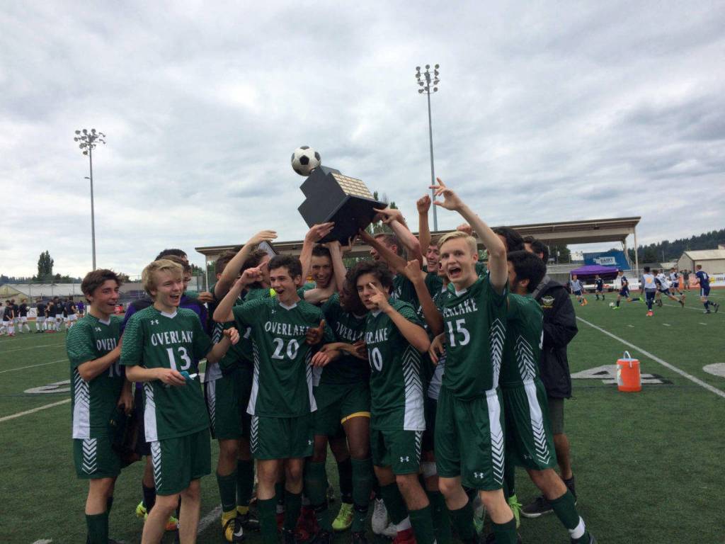 The Overlake Owls boys soccer team hoists the state championship trophy following their convincing 3-0 victory against the Wahluke Warriors in the Class 1A state soccer championship game on May 26 at Sunset Chev Stadium in Sumner. Shaun Scott, staff photo