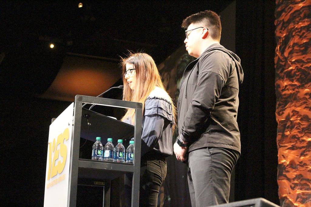 Rosa and Erik, whose last names have been withheld share their experiences being a part of Youth Eastside Services (YES) Latino H.E.A.T. student-leadership program at the Invest in Youth Breakfast on March 20. Madison Miller/staff photo