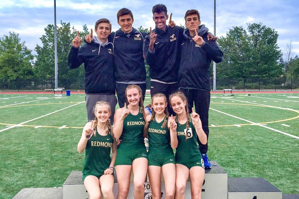 Members of Redmond High School’s 4×400 relay teams pose on the podium after last Friday’s 4A district track and field meet held at the Southwest Athletic Complex in West Seattle. Both teams finished first and will compete in the state meet this coming Thursday-Saturday at Mount Tahoma High in Tacoma. Pictured from left are: front, Anna Petrbokova, Sophie Rouse, Liv Wreggelsworth and Marie Petrbokova (4:04.27), and back, George Cretu, Carson Lui, Asres Morris and Eli Jones (3:25.47). In addition to the 4×400 relay teams, individual events entrants and their qualifying finishes at district include: Marie Petrbokova (200 – first, 26.25), Weston Ford (high jump – first, 6-02), Catalina Montanez (300 hurdles – second), Piper Ferch (long jump – second), Lili Hargreaves (1600 and 3200 – third and second), Lui (400 – third) and Dereje Himbago (3200 – third). Naho Masaki, Joanna Gormley and Jacob Raasch are also eligible to compete as alternates on the relay teams. Photo courtesy of Stuart Lui