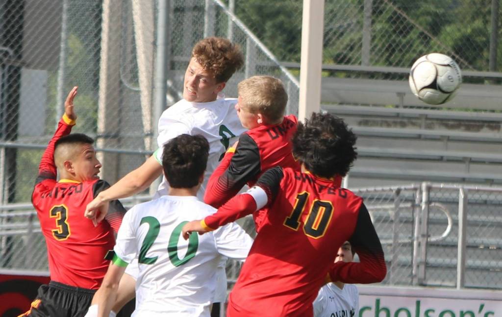 Overlake’s Evan Williams heads the ball past a pack of players against Winlock/Toledo on May 24 in the 1A state boys soccer semifinals at Sunset Chev Stadium in Sumner. Andy Nystrom/ staff photo