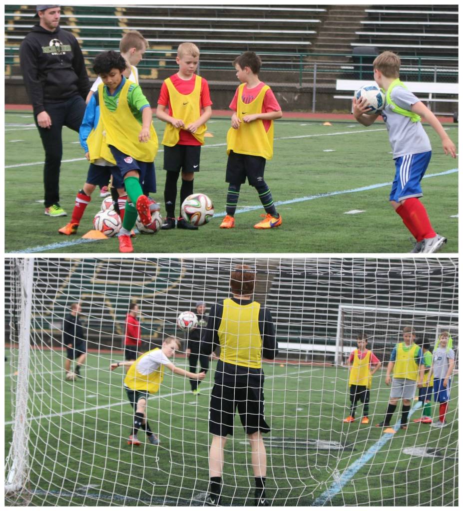 Campers kick away at the Redmond High boys soccer program’s Jr. Stangs Summer Camp on July 10. The three-day camp, which was open to boys in grades 3-8, featured instruction on soccer fundamentals such as dribbling, shooting, passing, defending and team play. RHS boys soccer coaching staff and players hosted the camp. Andy Nystrom/ staff photos