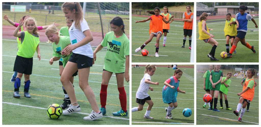 Young booters participate in the Jr. Stangs Soccer Camp on Tuesday at Redmond High. The three-day camp is open to girls ages 6-12 of all skill levels. The Redmond High School Girls’ Soccer Booster Club camp features passing and receiving, dribbling and fun moves, shooting, agility, mini tournaments for game-like experience and more. Andy Nystrom/ staff photos