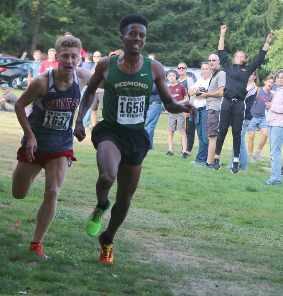 Redmond’s Dereje Himbago inches past Mount Si’s Paul Talens to win the junior boys two-mile race at the KingCo Jamboree on Sept. 11 at Lake Sammamish State Park. Himbago ran the race in 9:41.20 and Talens notched a time of 9:41.30. Himbago finished first overall in the combined four boys classes. Mustangs Cooper Arons won the boys senior race in 9:44.0 and Sophia Dahl won the girls freshman race in 11:33.70. Redmond senior Lauren Lehr took fourth overall (11:33.40) in the combined four girls classes. Andy Nystrom/ staff photo