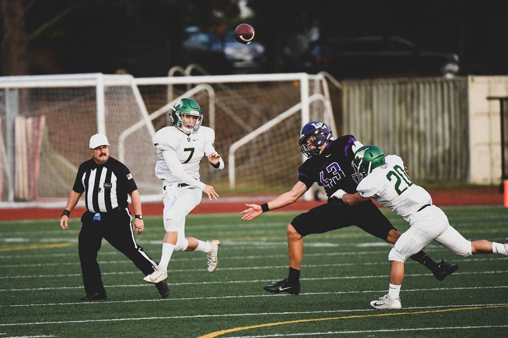 Redmond quarterback Tyler Fortney fires away against Lake Washington in the Mustangs’ 37-35 victory on Sept. 20. Also pictured are Henry Serr from Lake Washington and Bryan Aylward from Redmond. The Redmond scoring breakdown was a 30-yard field goal from Maroun El Dik and touchdowns from Anakin Downer (3-yard run), Zach Roper (runs of 57 and 18 yards), Colby Fazio (a 22-yard pass from Fortney) and Fortney (3-yard run). Fortney was 29-for-50 passing for 262 yards. Redmond will next play at Inglemoor (Pop Keeney Stadium) at 7 p.m. Sept. 26. Photo courtesy of Matt Campbell Photography