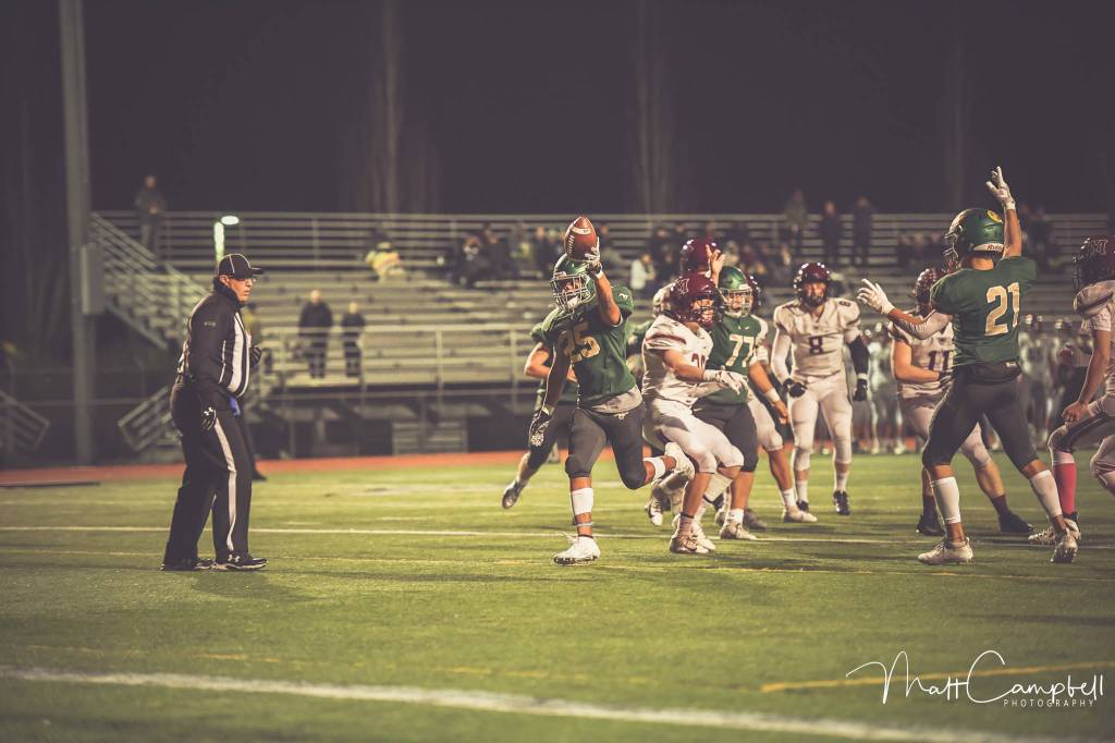 Redmond’s Zach Roper scores a touchdown during the Mustangs’ 49-24 victory over Mercer Island to close out the season on Nov. 8 at home. For the Mustangs, Roper scored twice and Colby Fazio, Tyler Fortney, Carson Bruener, Asres Morris and Matthew Janetzki notched one touchdown apiece. Maroun El-Deek nailed seven PATs. Photo courtesy of Matt Campbell