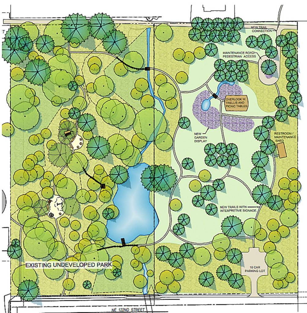 The city purchased the Smith Woods property — 176th Avenue Northeast and Northeast 124th Street — in northeast Redmond in 2000 and then secured the entire property in 2011. The property includes the Monticello Creek, where the stream flows into a small pond on the property. The pond appears to have been built by the former owner.