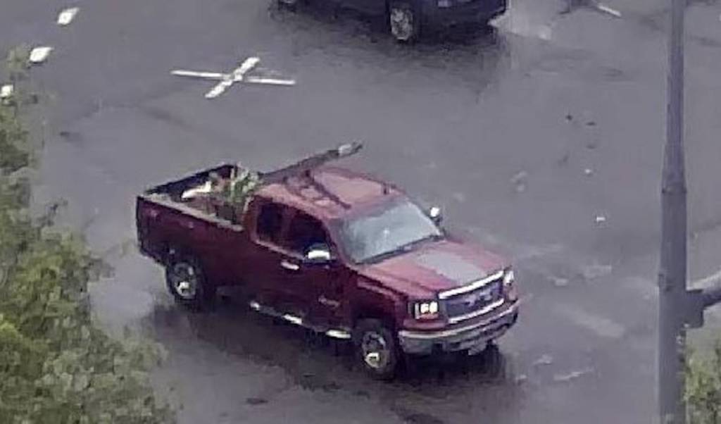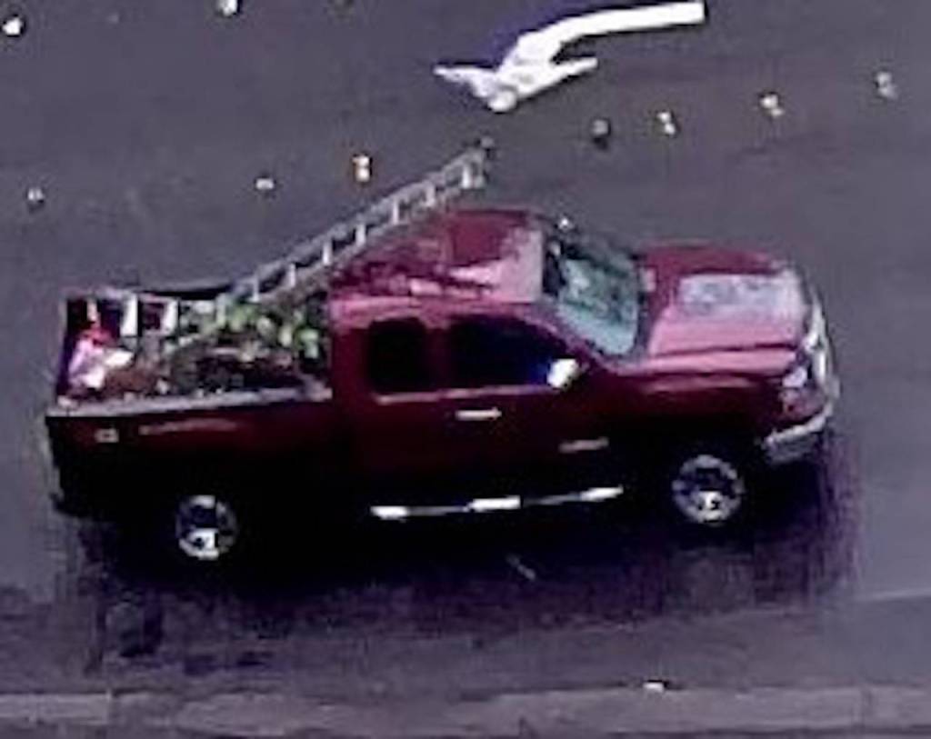The suspect, who remains at large, was driving a maroon GMC Sierra with a grey stripe on the hood. In surveillance footage, the vehicle is shown to be carrying a ladder.