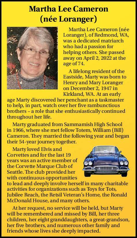Martha Lee Cameron (née Loranger), of Redmond, WA, was a dedicated matriarch who had a passion for helping others. She passed away on April 2, 2022 at the age of 74.