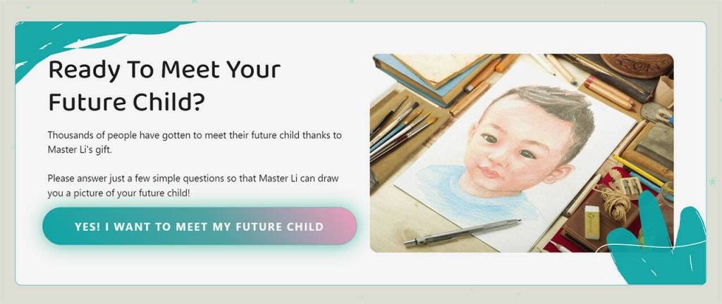 Like other astrology engagements, customers are asked to answer a few questions and submit their details and their partner’s birth date, country, ethnicity, and last names; these are used to create a physical connection and description. Master Li studies all the answers customers supplied and their traits; this helps him sketch a portrait of the baby.
