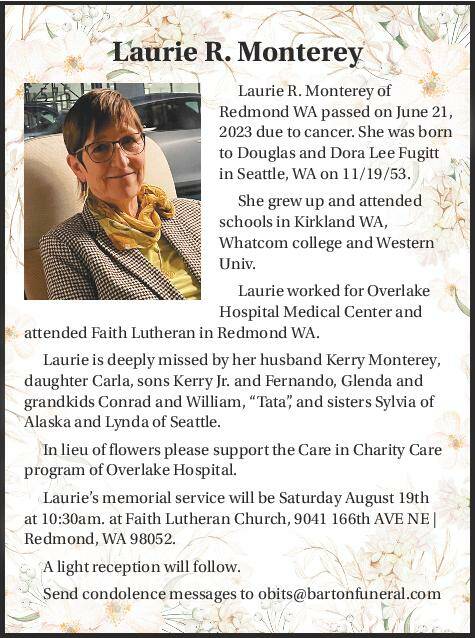 Laurie R. Monterey of Redmond WA passed on June 21, 2023 due to cancer. She was born to Douglas and Dora Lee Fugitt in Seattle, WA on 11/19/53.