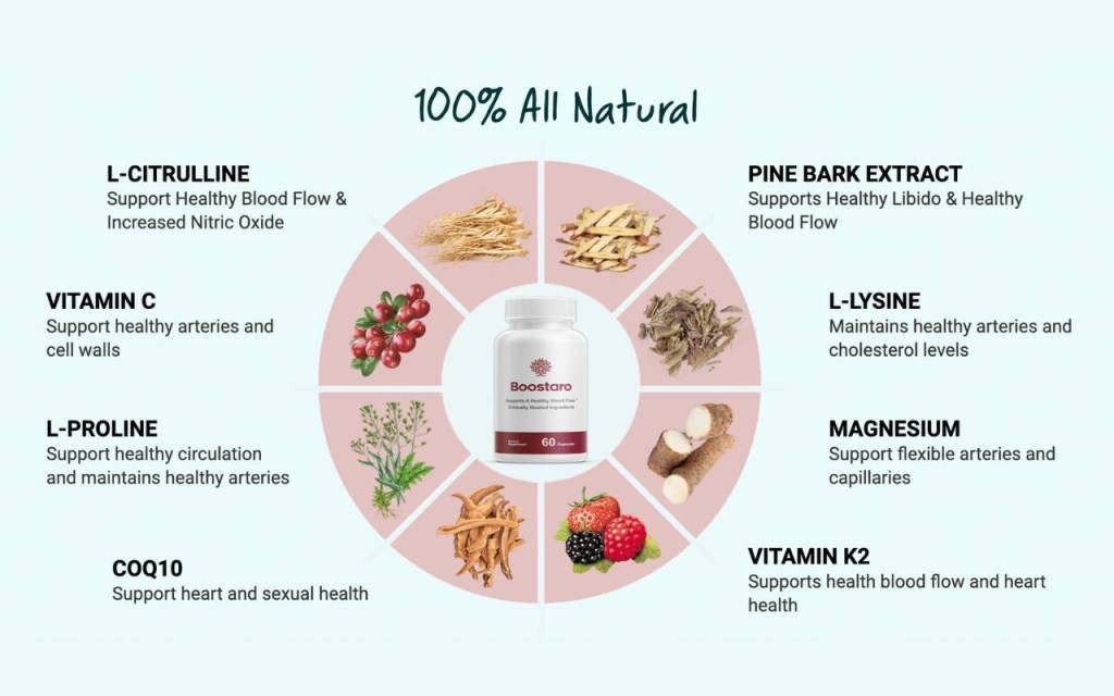 Key ingredients in Boostaro include L-Citrulline, Pine Bark Extract, Vitamin C, L-Lysine, L-Proline, Magnesium, CoQ10, and Vitamin K2. These components work together to support blood flow, libido, and heart health.