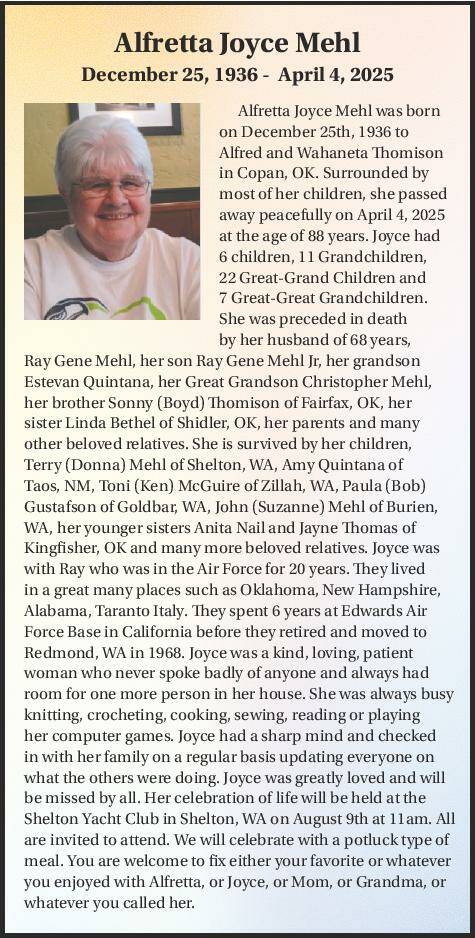Alfretta Joyce Mehl was born on December 25th, 1936 to Alfred and Wahaneta Thomison in Copan, OK. Surrounded by most of her children, she passed away peacefully on April 4, 2025 at the age of 88 years. Joyce had 6 children, 11 Grandchildren, 22 Great-Grand Children and 7 Great-Great Grandchildren. She was preceded in death by her husband of 68 years, Ray Gene Mehl, her son Ray Gene Mehl Jr, her grandson Estevan Quintana, her Great Grandson Christopher Mehl, her brother Sonny (Boyd) Thomison of Fairfax, OK, her sister Linda Bethel of Shidler, OK, her parents and many other beloved relatives. She is survived by her children, Terry (Donna) Mehl of Shelton, WA, Amy Quintana of Taos, NM, Toni (Ken) McGuire of Zillah, WA, Paula (Bob) Gustafson of Goldbar, WA, John (Suzanne) Mehl of Burien, WA, her younger sisters Anita Nail and Jayne Thomas of Kingfisher, OK and many more beloved relatives. Joyce was with Ray who was in the Air Force for 20 years. They lived in a great many places such as Oklahoma, New Hampshire, Alabama, Taranto Italy. They spent 6 years at Edwards Air Force Base in California before they retired and moved to Redmond, WA in 1968. Joyce was a kind, loving, patient woman who never spoke badly of anyone and always had room for one more person in her house. She was always busy knitting, crocheting, cooking, sewing, reading or playing her computer games. Joyce had a sharp mind and checked in with her family on a regular basis updating everyone on what the others were doing. Joyce was greatly loved and will be missed by all. Her celebration of life will be held at the Shelton Yacht Club in Shelton, WA on August 9th at 11am. All are invited to attend. We will celebrate with a potluck type of meal. You are welcome to fix either your favorite or whatever you enjoyed with Alfretta, or Joyce, or Mom, or Grandma, or whatever you called her.