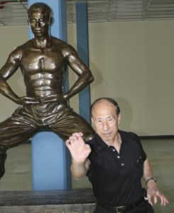 World-renowned martial arts Master John S.S. Leong strikes a pose in front of a statue given to him by grateful students