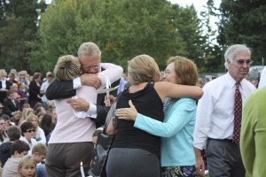 Family and friends embrace after a public memorial for Jackson Roos