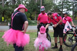 A young girl offers candy to Seattle bicycle police officers to thank them for riding inthe Susan G. Komen 3-Day.