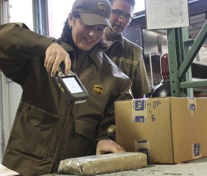 Congresswoman Suzan DelBene scans a package while UPS delivery driver Mike Vallimont watches on Wednesday morning at Triumph…