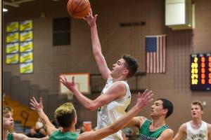 Redmond’s Aidan Rolfs (middle) scored 17 points to lead the Mustangs to a 60-55 victory over Woodinville on…