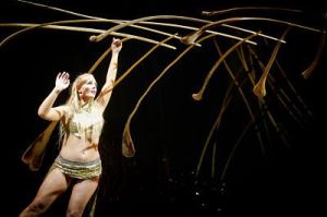 Lara Jacobs Rigolo carefully balances palm ribs in her “Manipulation” performance under the Cirque du Soleil big top.