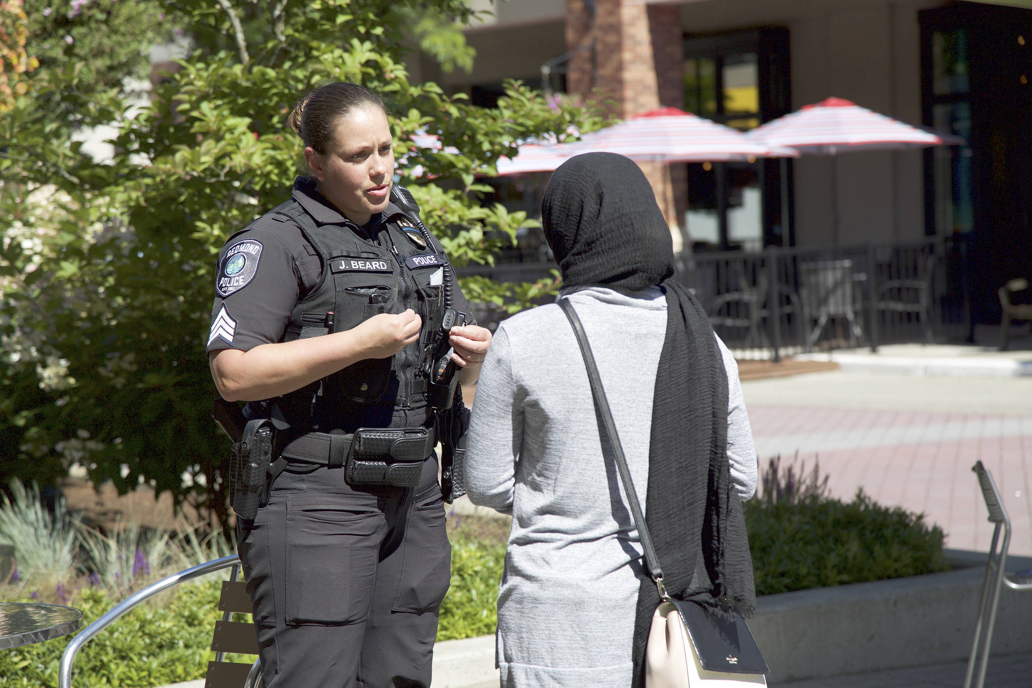 Above: Sgt. Julie Beard interacts with Yasemin Garza, 2, and Myrna Garza, during the Redmond Police Department’s Coffee with a Cop event on July 25, in Redmond Town Center. The gatherings give citizens an opportunity to interact with officers one-on-one and ask any questions they might have about community concerns or safety.