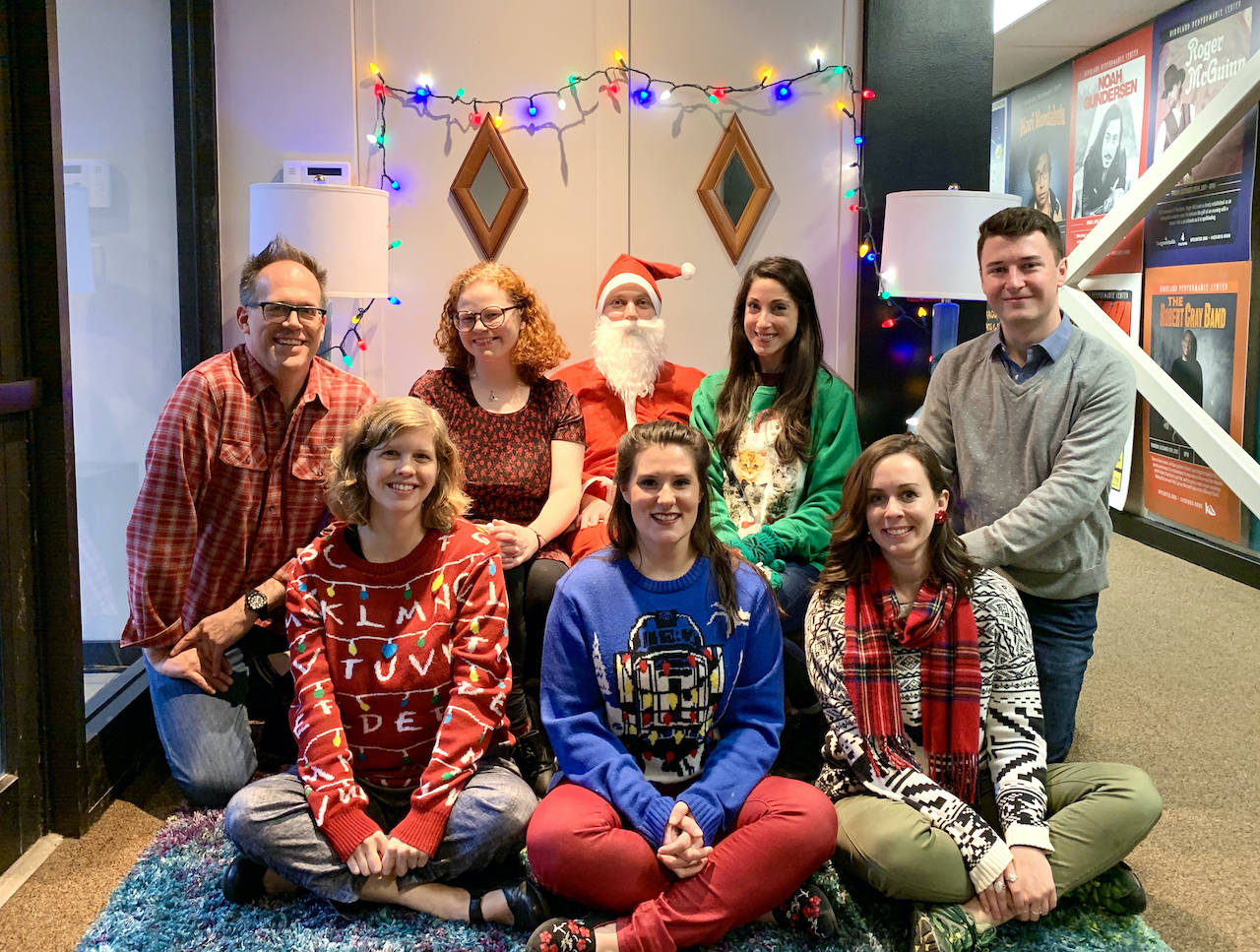 A Kirkland Performance Center staff photo, which was featured on the organization’s 2019’s holiday card. From left to right: Jeff Lockhart, Anna Espe, Hannah Ekness, David Bander, Mari Cannon, Skye Stoury, Kayla Teel and Jacob Gannon. Photo courtesy KPC