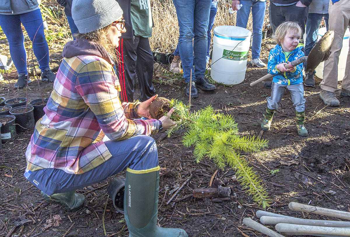 The two fieldwork consultants greet me as I roll up on the gravel road in the truck. Together, we go over the plan for the day and map out the locations where we will be collecting data on vegetation in the wetland. This site was once an open field, but the Port of Seattle converted it to wetland about a decade ago. Using our plant identification and navigation skills, our team will locate and count plants, shrubs, and trees at various sites. This data will be used to track the health of the wetland over the years. We need 16 wooden stakes, two 100-foot tape measures, and neon-pink marking tape to do our work today. Then, we do a safety check and put on our sunscreen, bug spray, waterproof work boots and orange vests before heading into the wetland.
