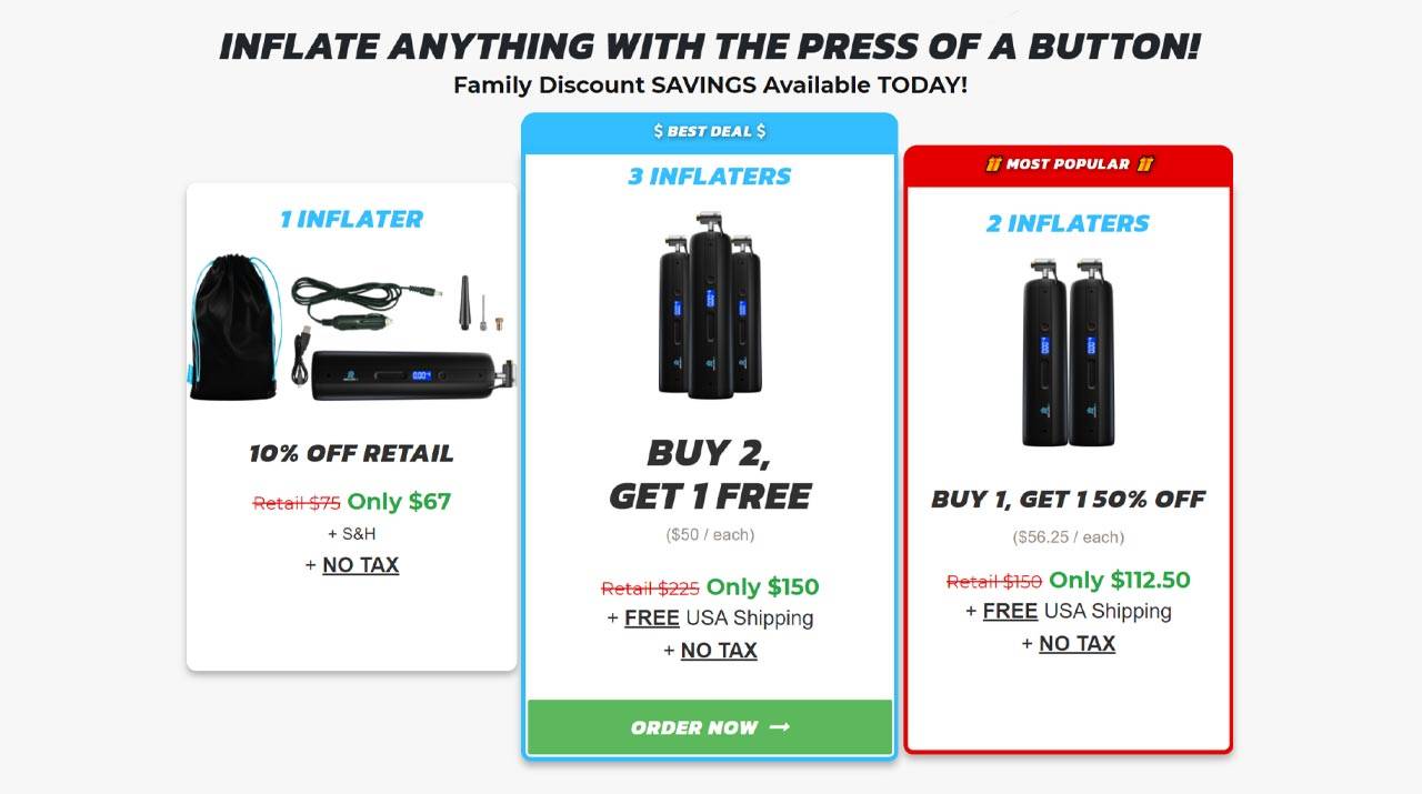 - Buy 2 InflateR and get 1 Free for a total of $150 + Free US Shipping
