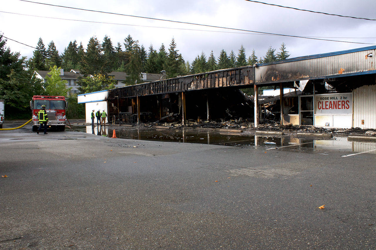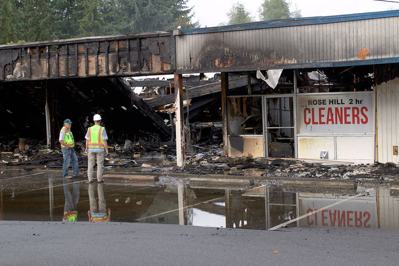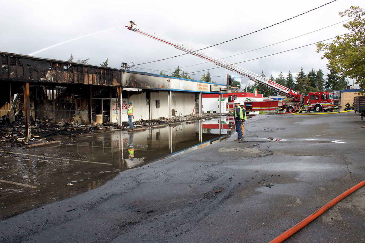Kirkland firefighters and Puget Sound Energy staff examine the aftermath of a four-hour fire that destroyed the Rose Hill Village and “annihilated” Decks and Spas. Kailan Manandic/staff photo