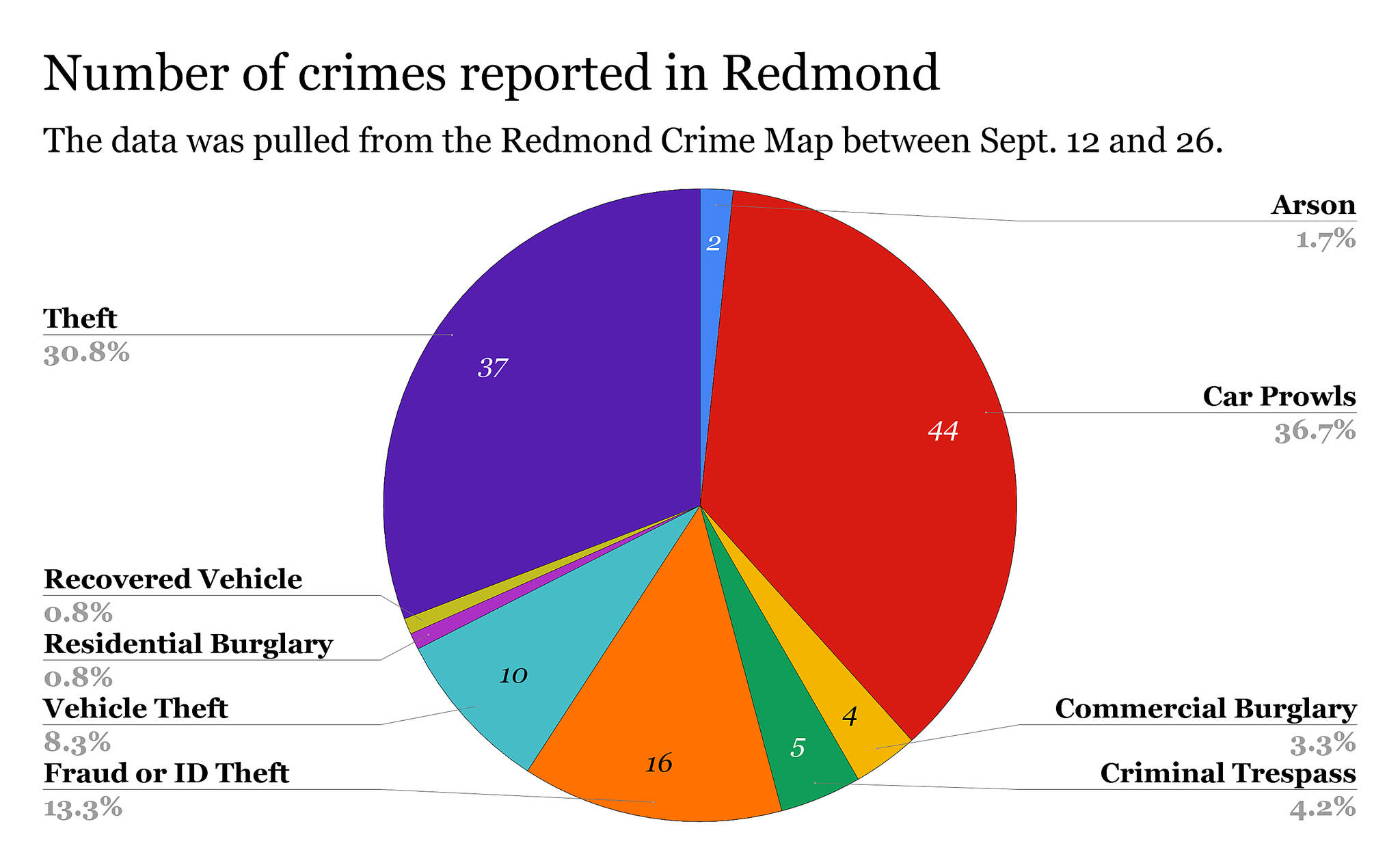 There were 121 property crimes reported between Sept. 12 and 26, car prowls made up about 36 percent of those crimes and 25 percent of all crime reported in Redmond, including traffic accidents.