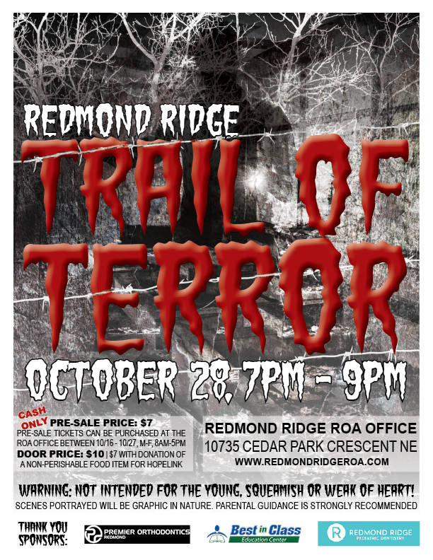 The Redmond Ridge Residential Owners Association (ROA) presents its first haunted trail attraction, the Trail of Terror, from 7-9 p.m. Oct. 28. The trail starts at the ROA office located at 10735 Cedar Park Crescent N.E.