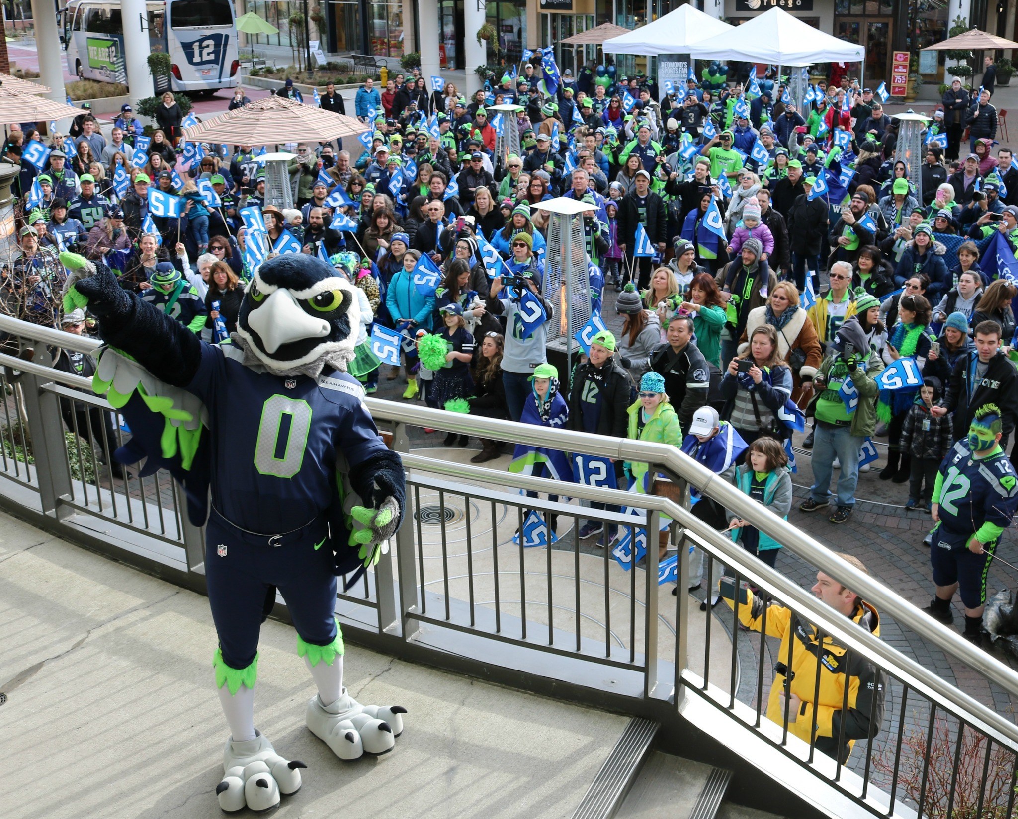 Seattle Seahawks fans and mascot Blitz cheer on their team at today’s rally at Redmond Town Center. The Seahawks will play at Atlanta tomorrow in an NFC divisional playoff game.