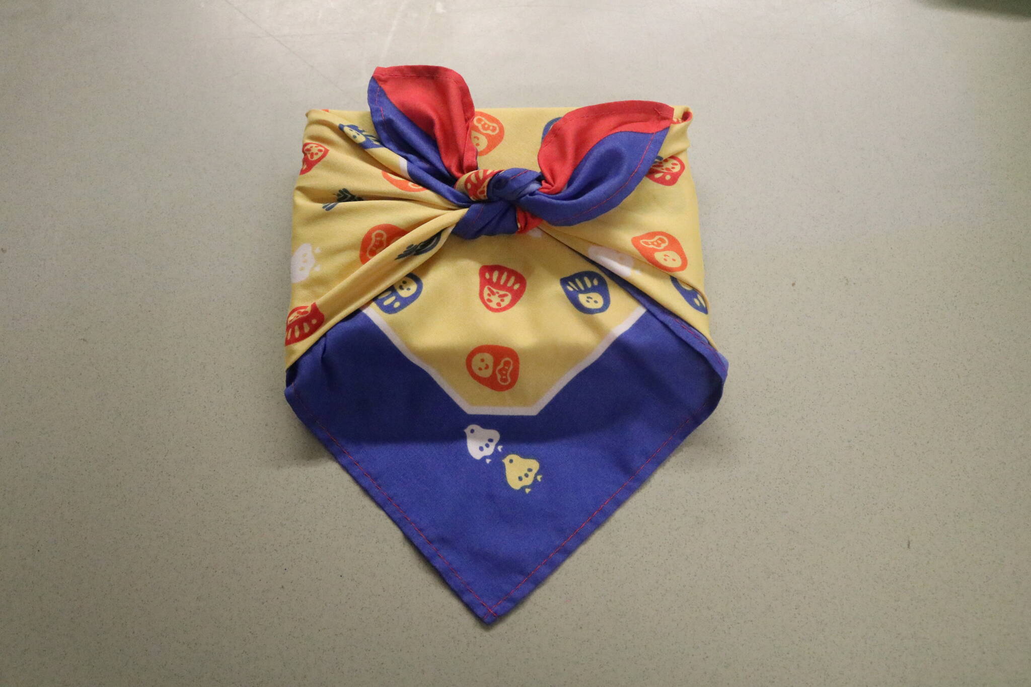 “It only takes two knots, which are called musubi. One knot is called musubi-hitotsu and a square knot is ma-musubi,” said Miyauchi, adding that the only limitation to using furoshiki is the size of the object one wants to wrap in relation to the cloth and one’s own imagination.
